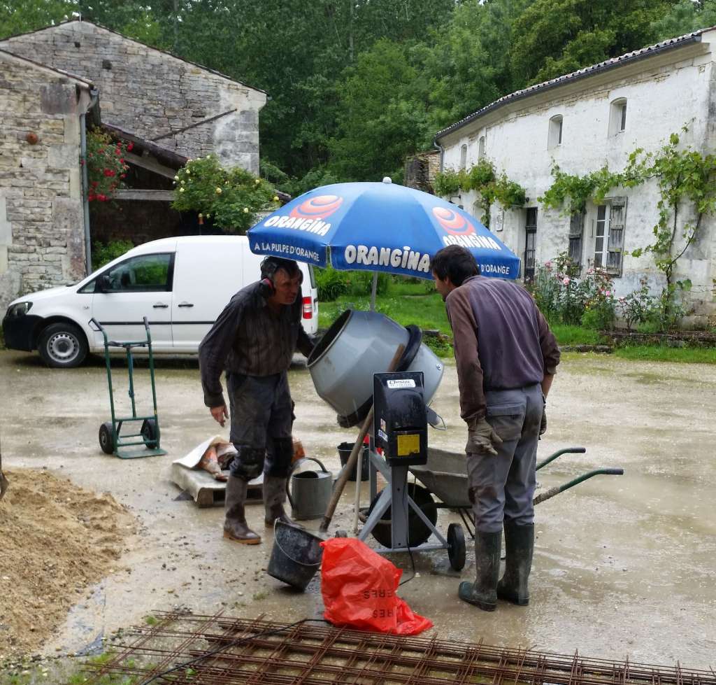 En ces deux premiers jours de mai, c’est avec la pluie que nous continuons les travaux. Au programme : coulage de la première ceinture en béton armé.
