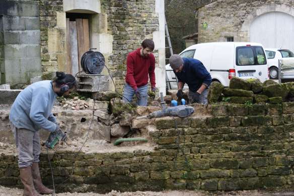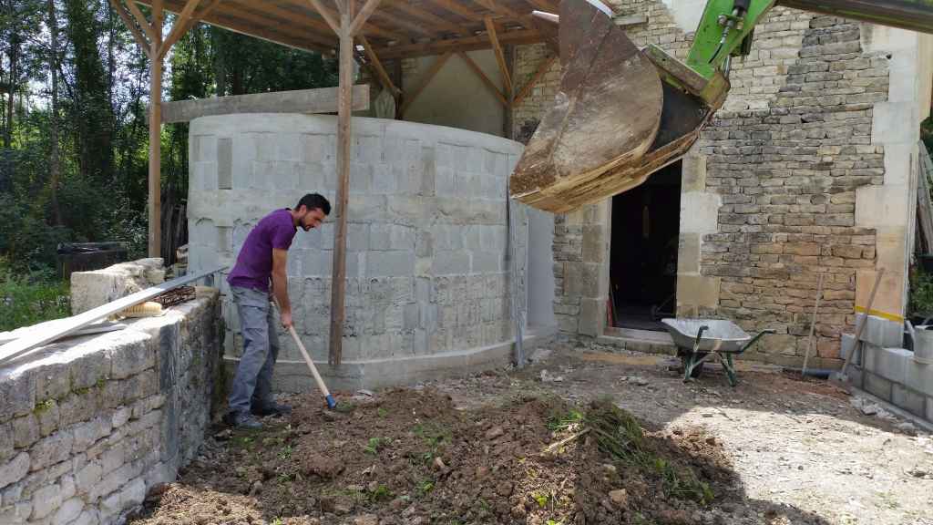 Un début de four avait été commencé il y a trois à quatre ans. Comme les plans ont évolué avec les nouveaux projets du lieu, nous avons choisi de repartir de zéro. La présence d’un petit cour d’eau longeant le fournil, la forte probabilité d’inondations chaque hiver ainsi que les 30 à 40 tonnes de matériaux qui vont constituer le four, nous obligent à prévoir des fondations solides.