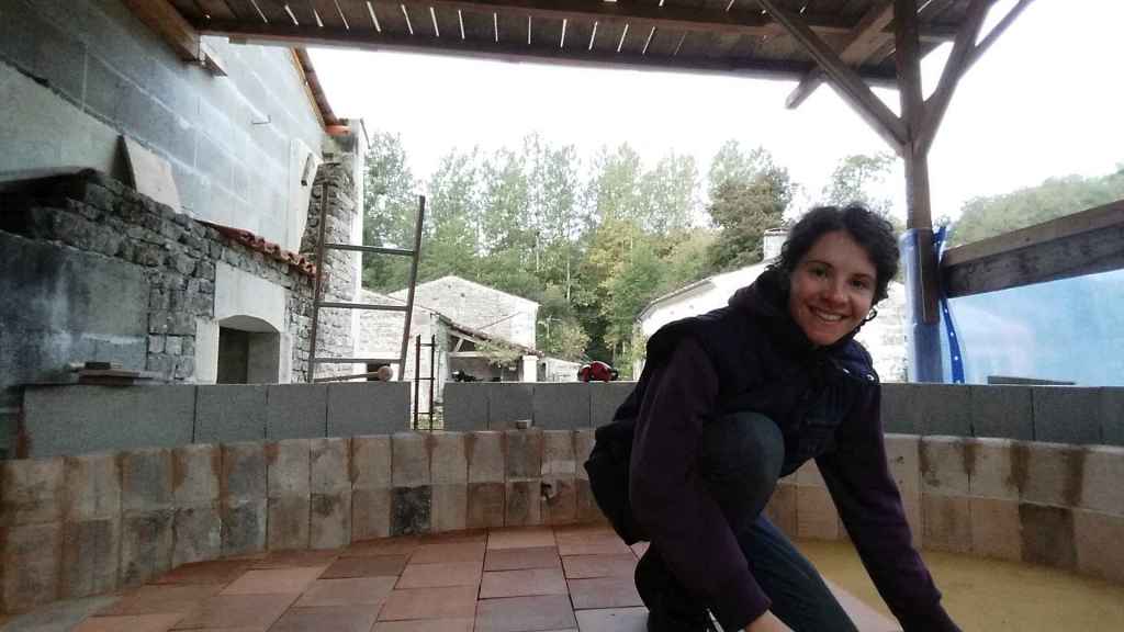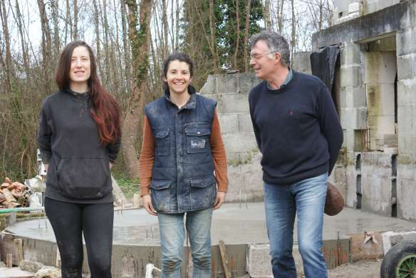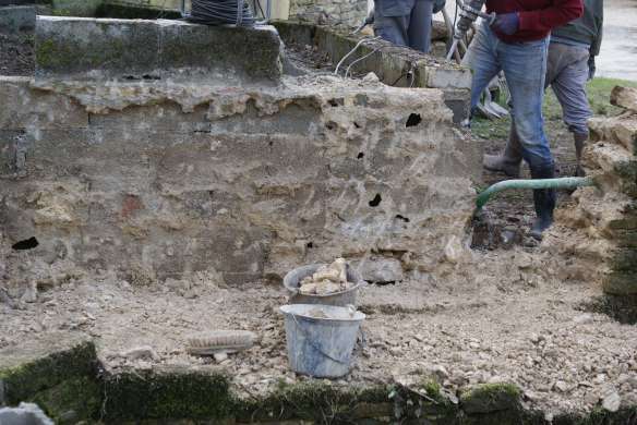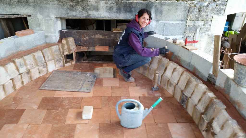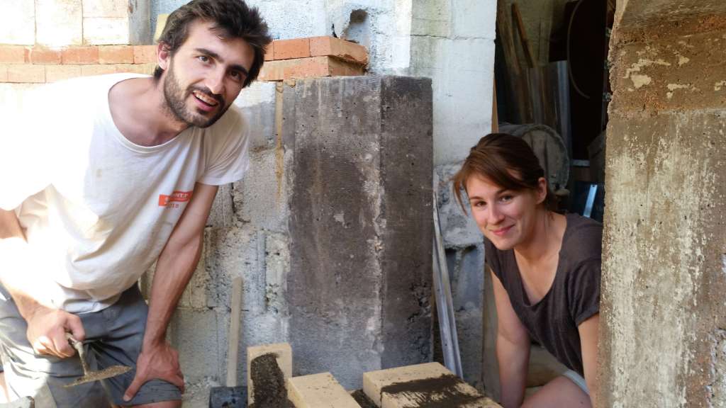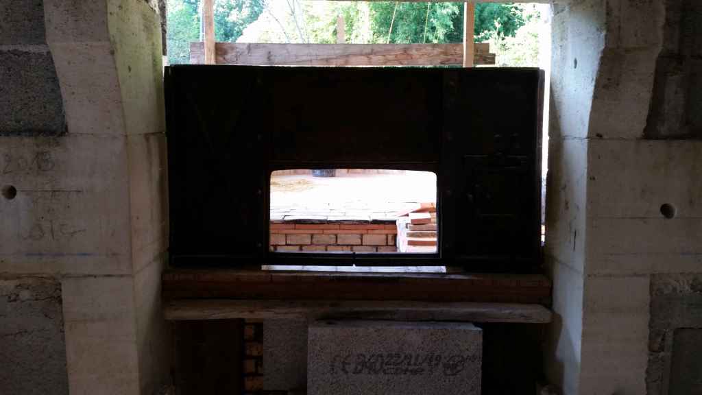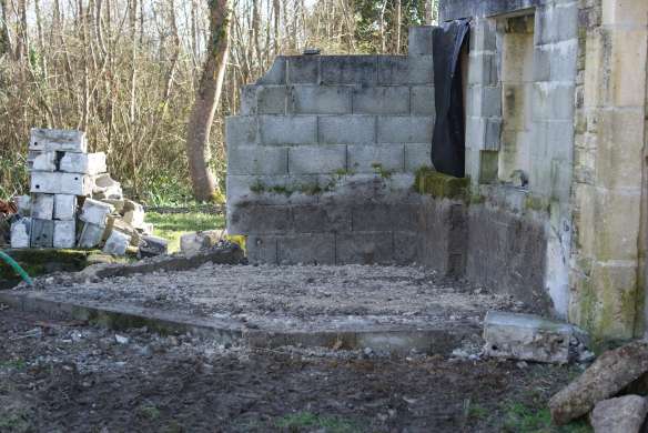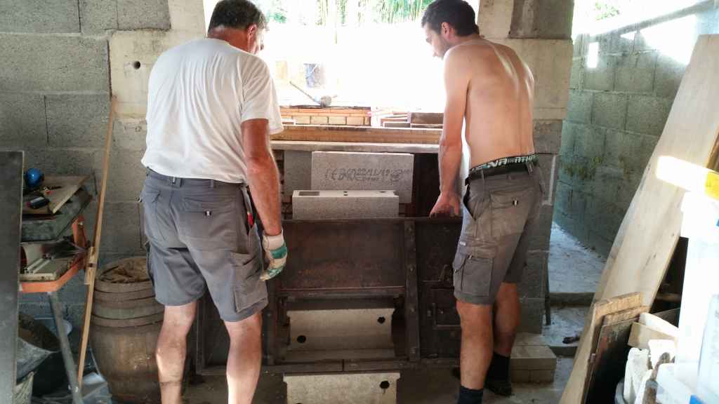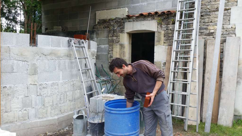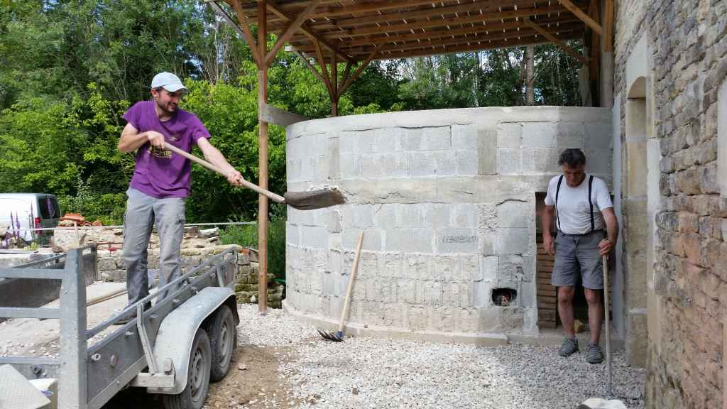 Afin que les différentes parties du four soient au maximum indépendantes dans l’idée de les restaurer si besoin, nous avons monté un mur de parpaings autour du foyer.