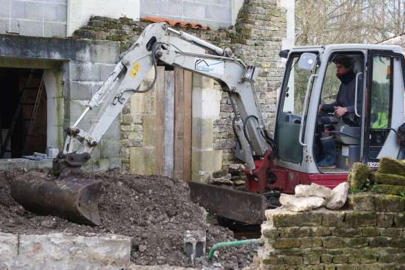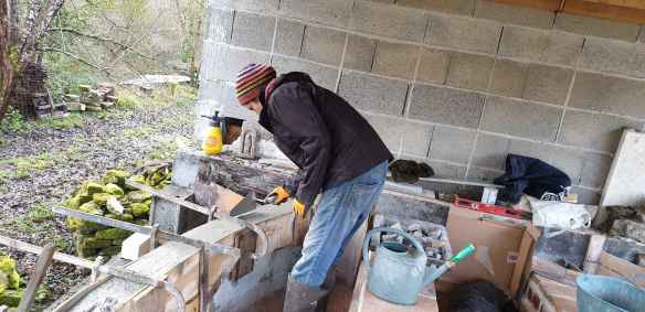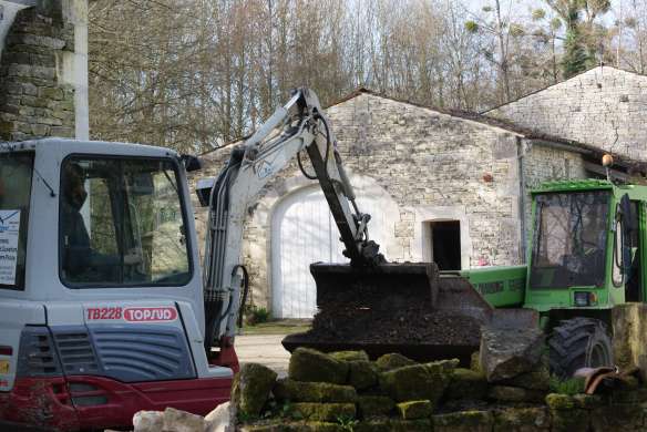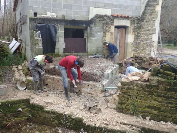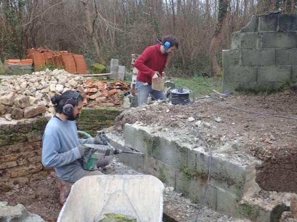 Donc pour commencer, chantier taille de bois autour du cour d’eau pour faire de la place, déconstruction du muret et du socle du premier four, aplanissement à la mini-pelle. Merci à ceux qui nous ont prêté mains fortes pour ces trois premiers chantiers !