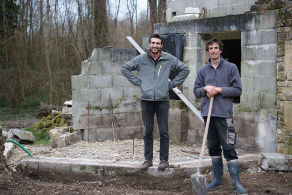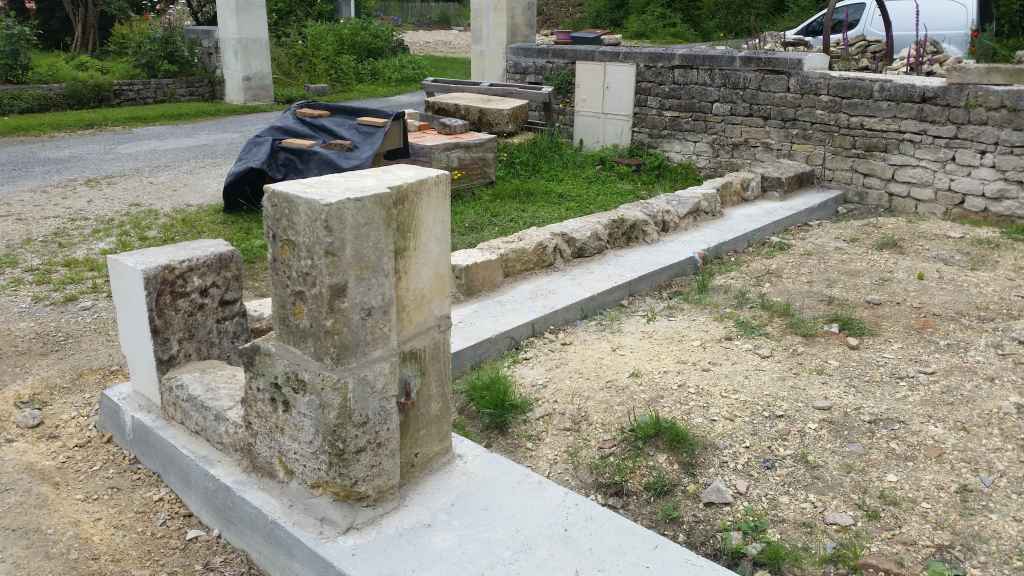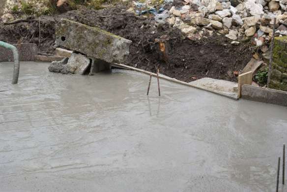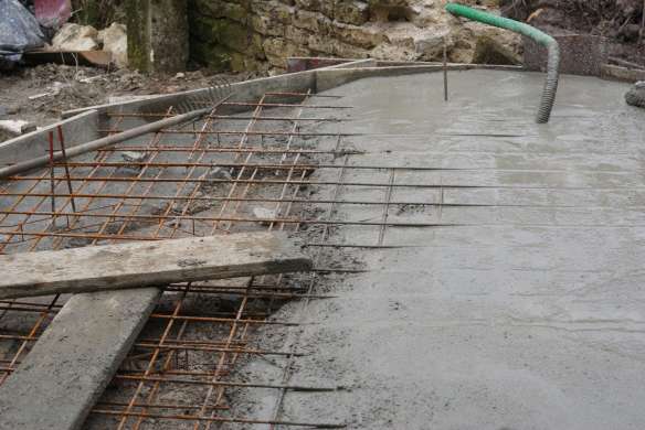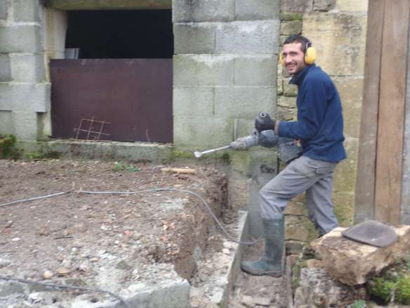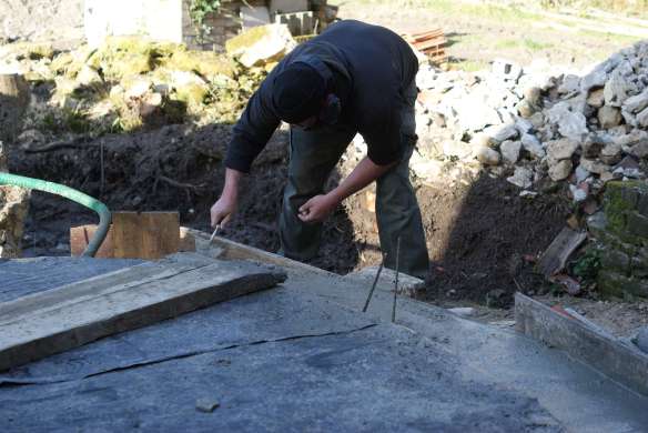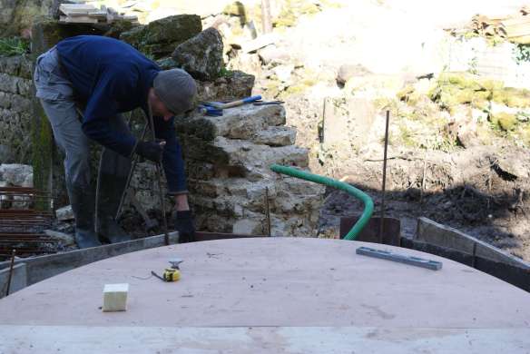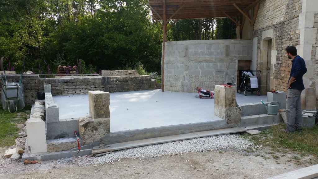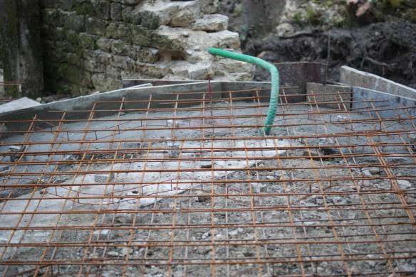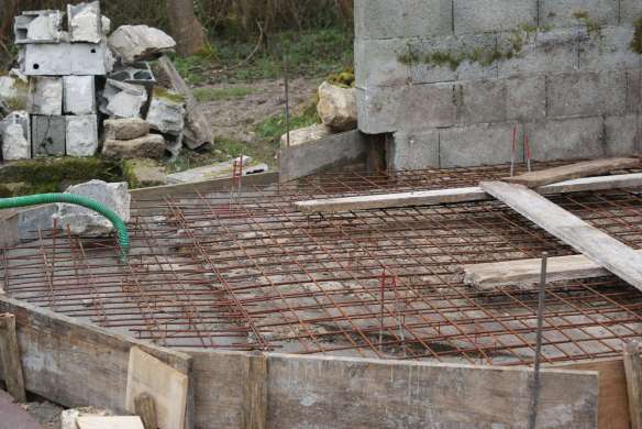 Nous prolongeons le bâtiment existant par un bâtiment de 43 m² qui couvrira le four et servira de local de stockage pour le bois de chauffe. Pour le moment on se contente des fondations et de la dalle en béton armé… la suite viendra plus tard.