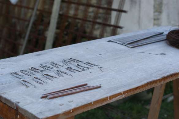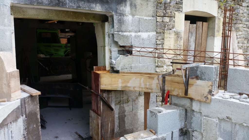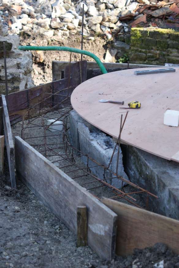 On continue dans les ceintures… une deuxième est coulée pour supporter la poussée horizontale de la voûte. Elle se situe sur la moitié extérieure du mur, contrairement à la première qui se situait sur la moitié intérieure.