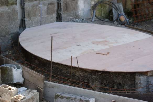 Avant de couler les fondations, nous avons modélisé grandeur nature la sole du four sur planches de contreplaqué afin de creuser la tranchée tout autour.