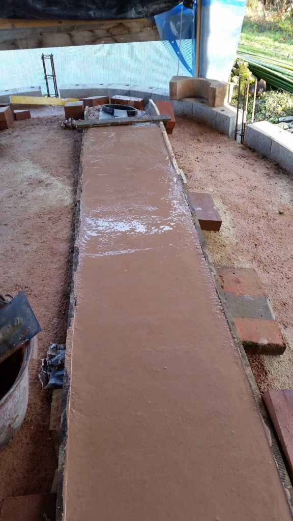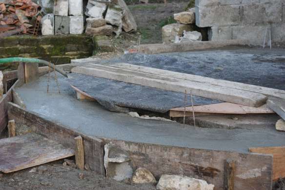 Pour les fondations, nous avons coulé une ceinture de 50cm de large sur 30cm de hauteur au niveau du pourtour du four. Puis nous avons coulé la chape sur une douzaine de cm qui sera la base du four.
