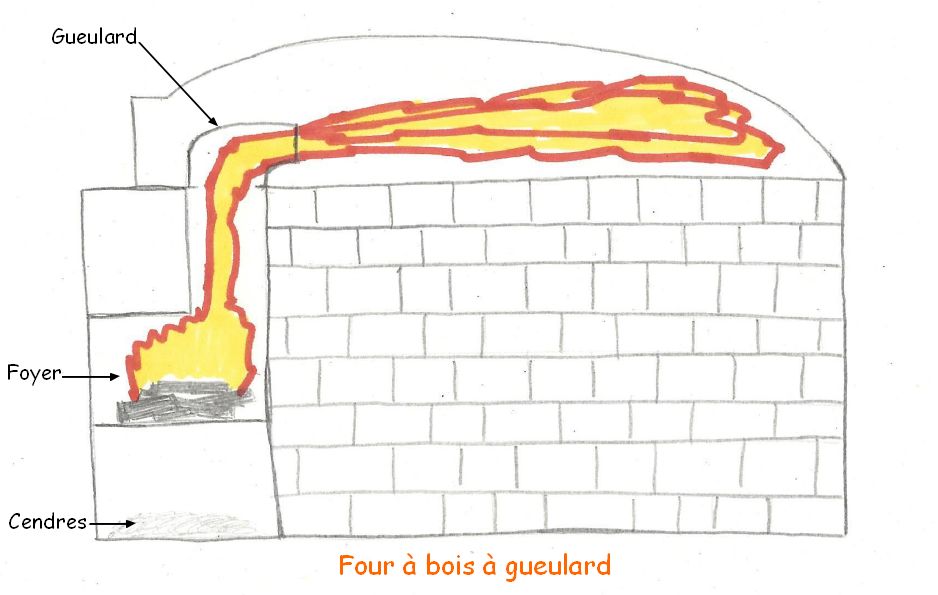 En 2020 nous avons commencé des travaux dans l’objectif de créer un fournil équipé d’un four à gueulard maçonné, auto-construit. Qu’est-ce qu’un four à gueulard ? C’est un four « à bois à chauffe directe » car la flamme est en contact direct avec la chambre du four. Cependant le foyer est décalé en dessous de la sole* ce qui permet (entre autres) de ne pas avoir à enlever les braises avant d’enfourner.