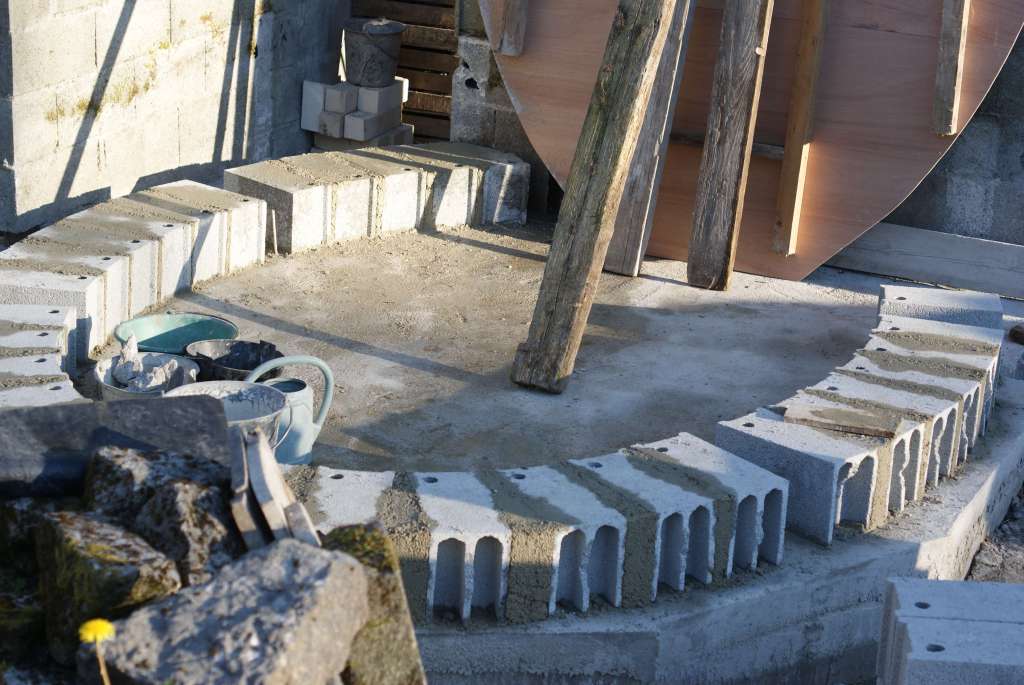 Pour la structure du four, nous avons monté 3 rangées de parpaings (20-25), en suivant la courbure du gabarit de la sole. Nous les avons tous coupés à la disqueuse à 40 cm de long pour un gain de place, et aussi car nous avions prévu la chape pour cette longueur. Les 10 cm de parpaings restant nous serviront dans la construction du bâtiment.