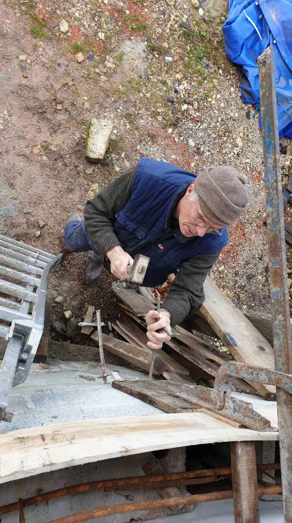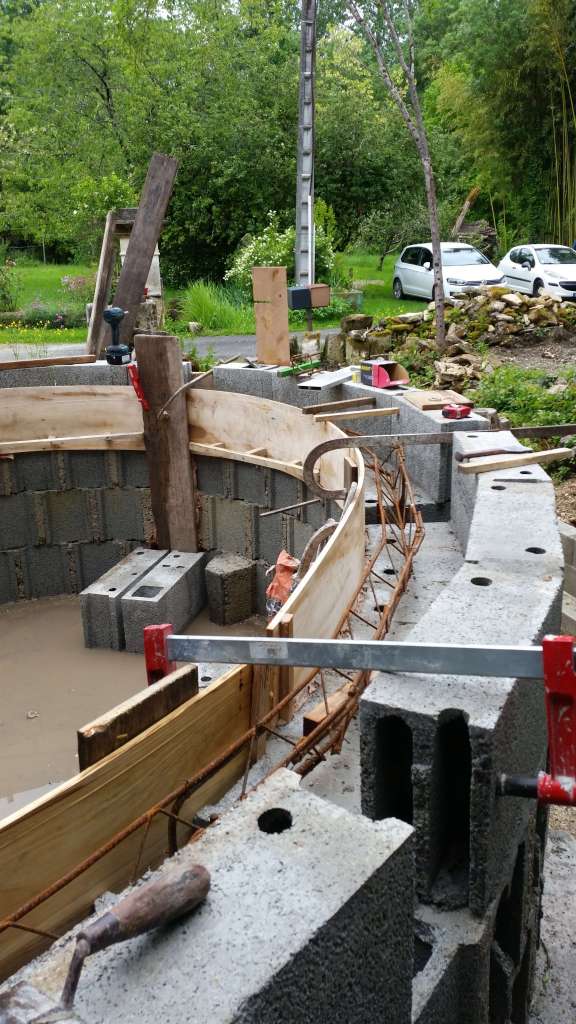 Le coffrage est plus complexe car il faut coffrer des deux côtés avec des planches. Toutes sont passées à la raboteuse pour être d’une épaisseur de 5 mm afin de suivre la courbure. Ceinture d’une hauteur de 24 cm par 15 cm.