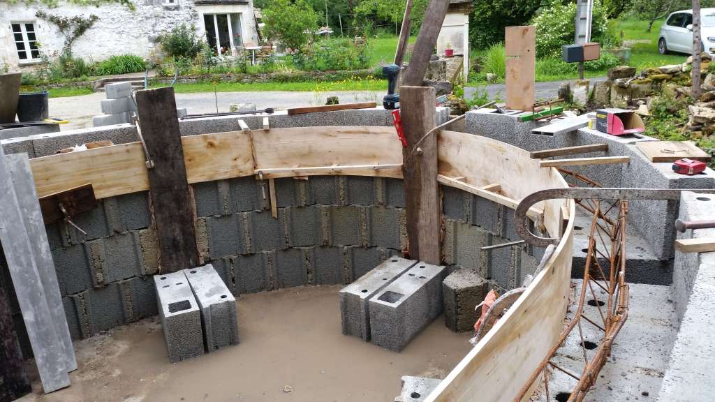 Pour le coffrage extérieur de la ceinture, pose d’une quatrième rangée de parpaings, mais dans l’autre sens (voir photos). Pour le coffrage intérieur, utilisation de planches de volige en peuplier. Pour les cintrer comme il faut, nous les avons rabotées au 1/200 de leur rayon de courbure, puis trempées dans l’eau quelques heures.