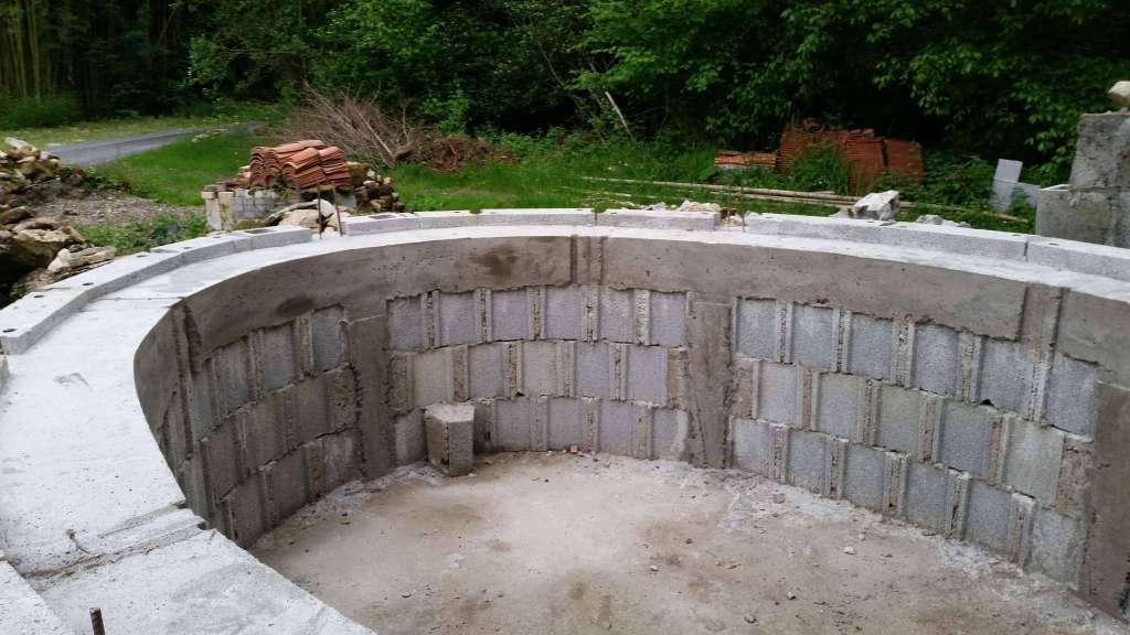 Au dessus des 3 rangées de parpaings, nous avons coulé une première ceinture en béton armé, d’une largeur de 25 cm et d’une profondeur de 18 cm. Cette ceinture soutiendra la charge verticale de la voûte.