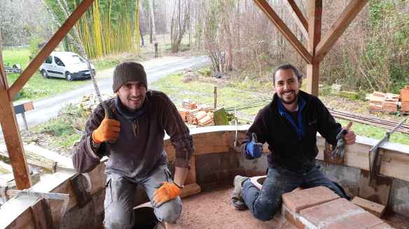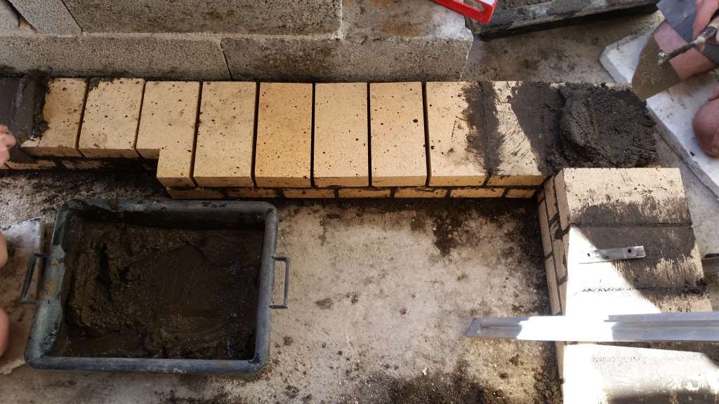 C’est bon, on y est ! Première pose de briques ! Celles-ci se situent sous la voûte, elles ne seront pas visibles une fois le four terminé mais elles contribuent à l’isolation du four.