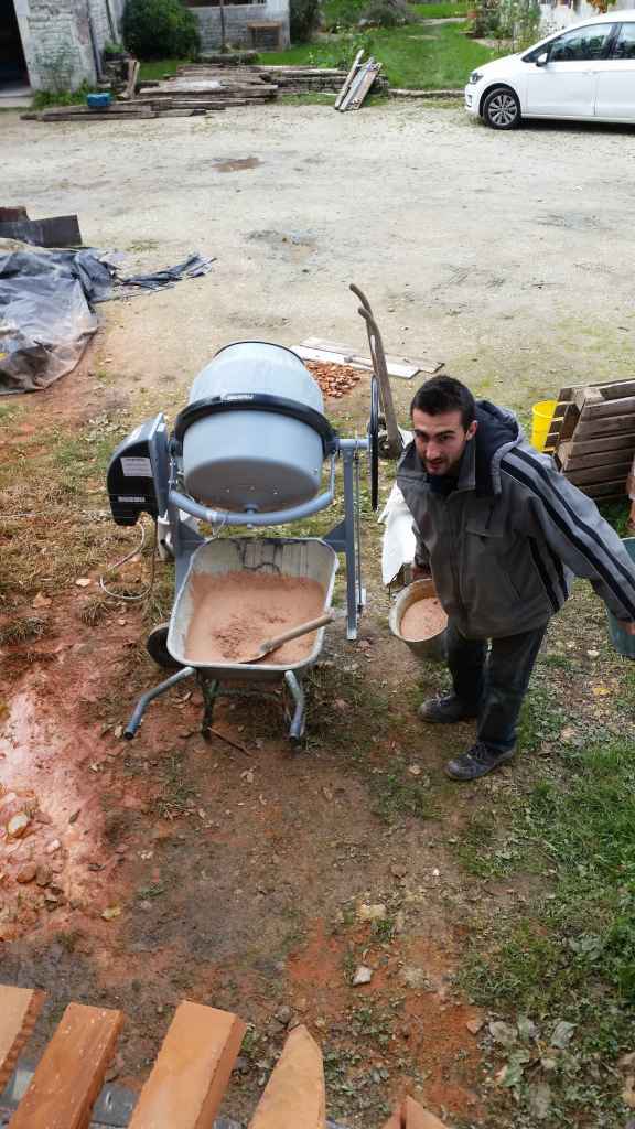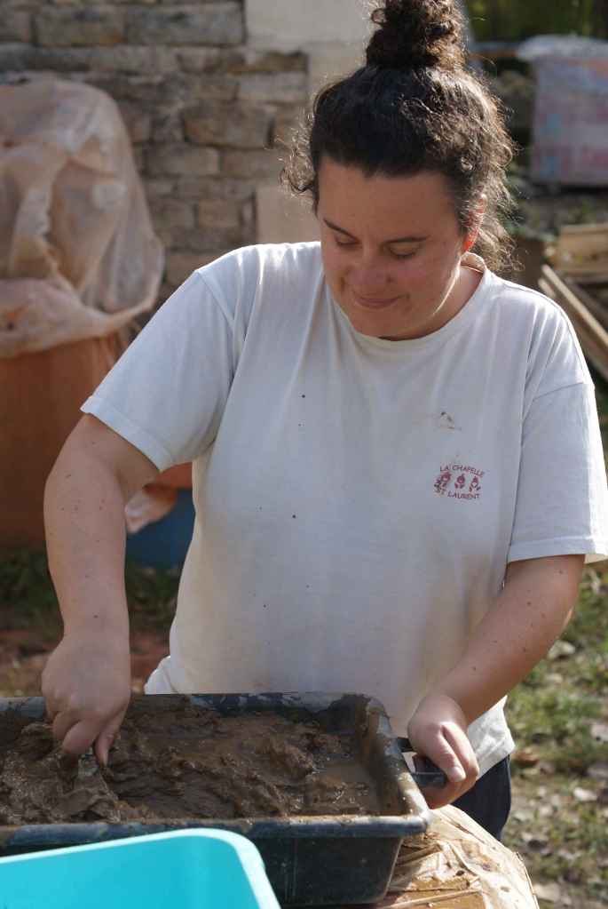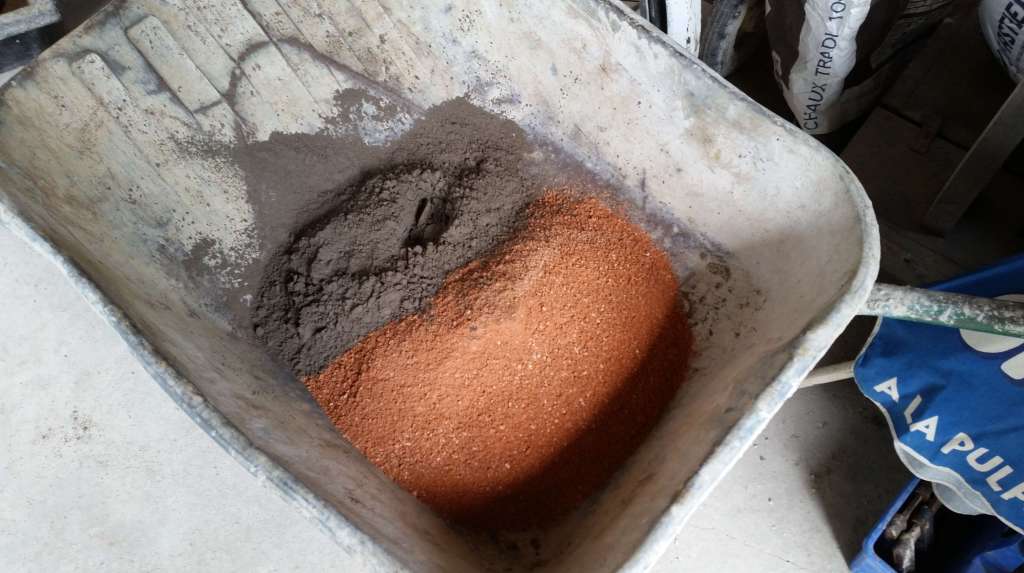 Pour le liant, on utilise de l’argile mélangé à de l’eau et un peu de sable (une pelle d’argile/une pelle de sable/de l’eau pour une consistance « mousseuse »).