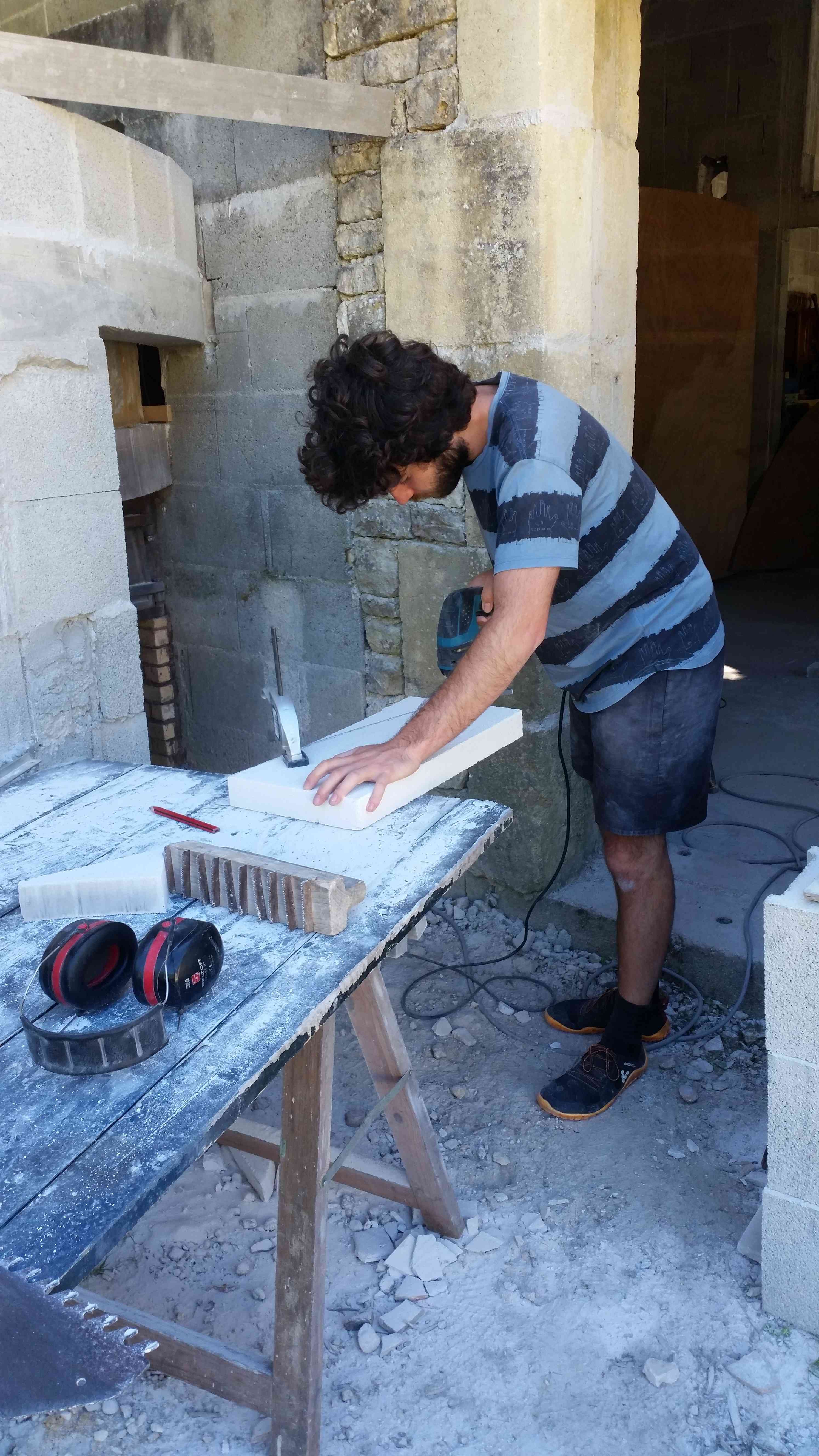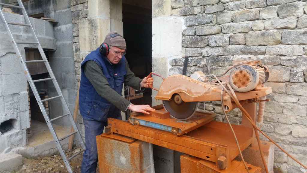 Pour les découpes de briques nous avons une scie circulaire sur table avec arrivée d’eau pour faciliter la coupe. Cette machine nous a permis de faire des découpes assez précises.