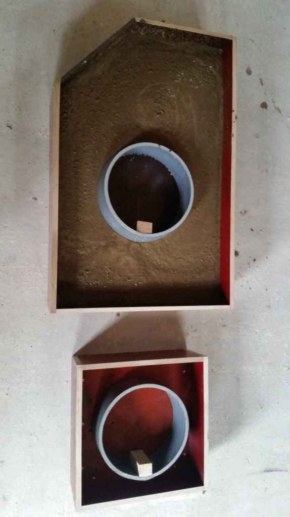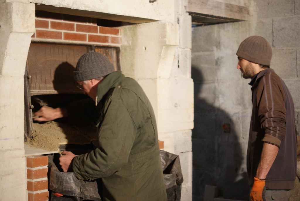Le foyer est désormais fermé par une pièce en béton réfractaire que nous avons coulé dans un moule auto-construit. A vrai dire, ce sont même deux pièces posées l’une sur l’autre. Elles épousent la forme du four et et du foyer. L’idée est de pouvoir changer ces pièces si un jour elles venaient à s’user.