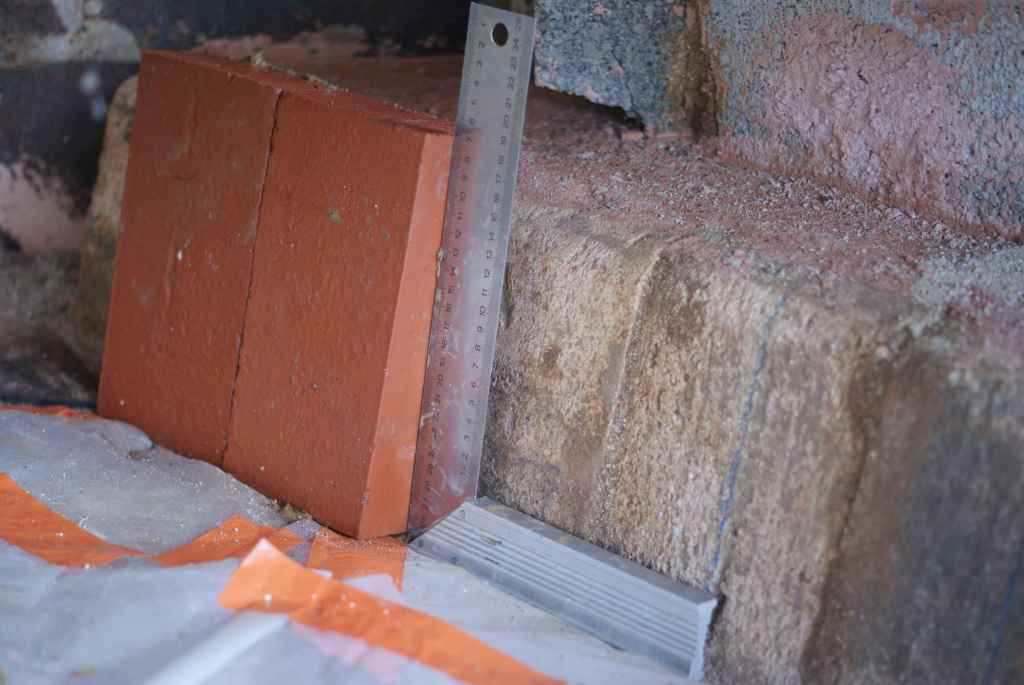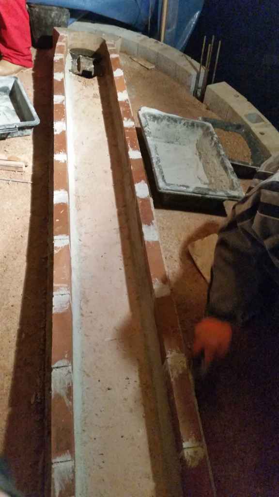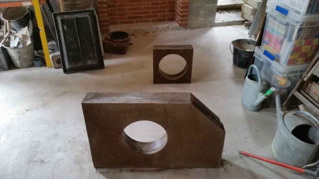 Au dessus des deux rangs de briques réfractaires, ce sont les pieds droits qui ont pris place. De base carrée 14 cm par 14, d’hauteur 30 cm jusqu’à l’arrête, le haut en biseau. Cette forme particulière permet le départ de la voûte.