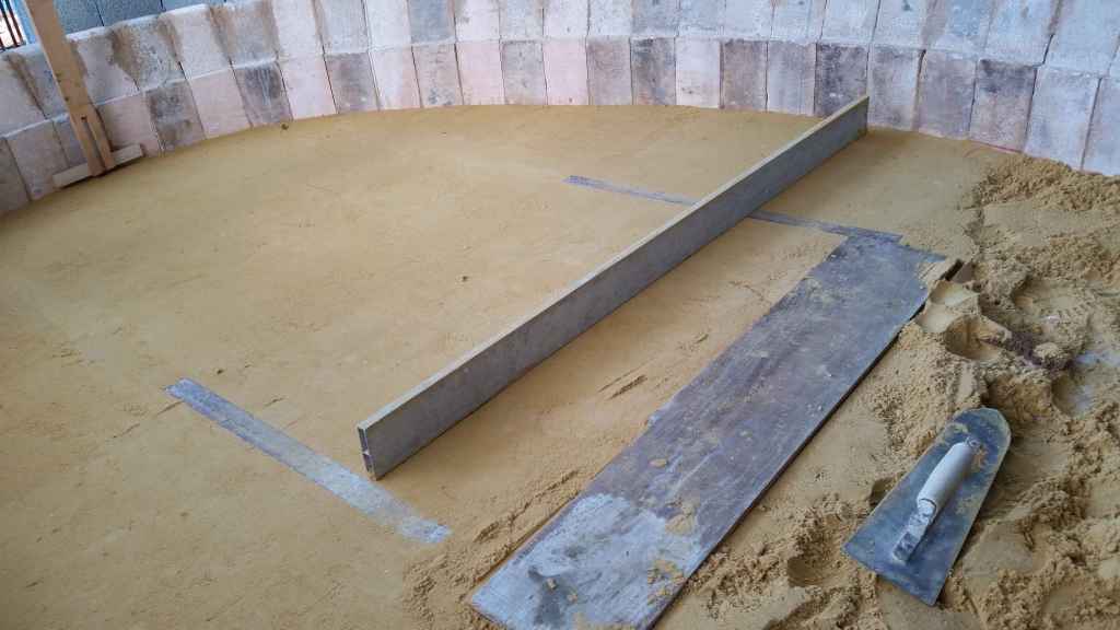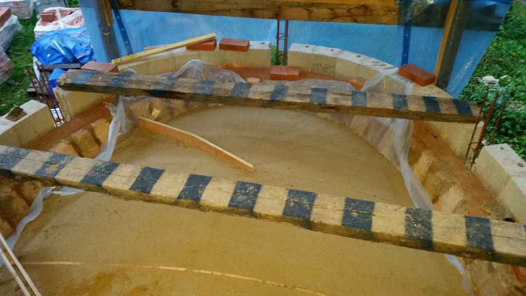 Il est temps désormais de s’attaquer à la voûte du four. Nous commençons par façonner un dôme de sable sur la sole qui correspond « exactement » à la forme de la voûte. Pour cela on a découper des gabarits représentant les différentes courbures de la voûte et nous les avons placés dans le four. Le sable est tassé à plusieurs reprises, et mis de niveau avec une règle qui glisse entre deux gabarits. Remarquant que cela ne suffisait pas pour les bords du four, nous avons en plus créer deux « compas » pivotant.