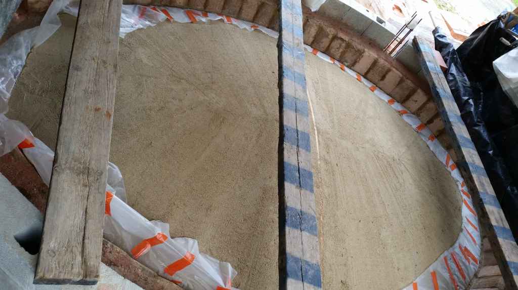 Afin de solidifier la voûte, nous coulons une couche de mélange chaux-chamotte sur environ 4 cm d’épaisseur. Cette étape est réalisée en deux fois, d’abord un mélange assez liquide pour qu’il rentre bien dans les interstices des briques, puis un mélange plus grossier pour envelopper la voûte.