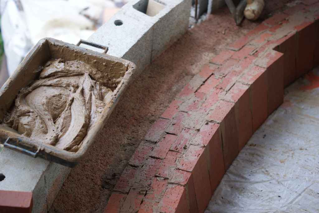 Les briques sont posées à la verticale, recouvertes plus ou moins de liant sur les 2/3 de la partie haute de la brique, sur sa face arrière et sur le chant, selon l’équerrage nécessaire dans les deux sens. Pour le liant nous utilisons de l’argile tamisé mélangé seulement à de l’eau (texture pâte à tartiner).