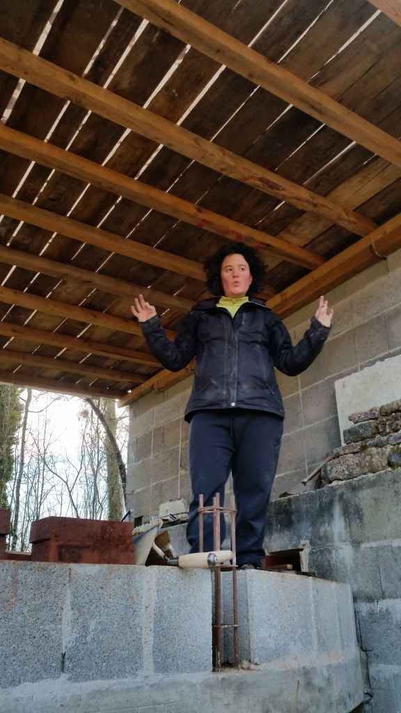Nous ne trouvons aucune information technique concernant la hauteur des cheminées de four à pain. Nous décidons de nous arrêter suivant les normes françaises (DTU 24.1) à 40 cm au dessus du faitage. Si le tirage n’est pas correct après les premiers essais nous monterons encore de quelques niveaux la cheminée.