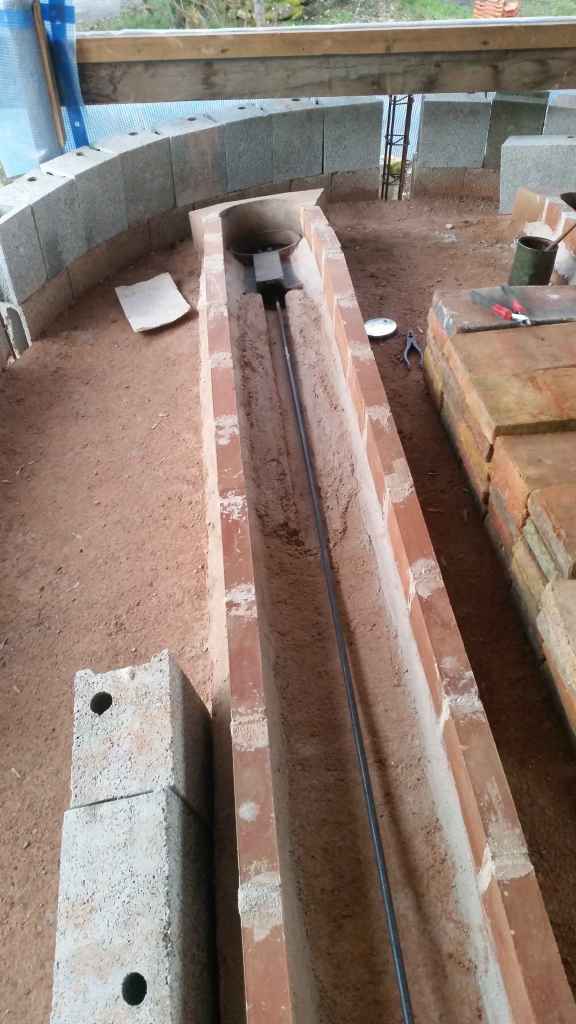 Nous coulons d’abord deux assises en chaux-chamotte. L’assise recevra le tirant qui permettra d’ouvrir ou fermer le clapet du oura depuis la façade du four. De chaque côté de l’assise, nous montons un muret en briques, posées sur la tranche, et enfin nous refermons le conduit par des briques de taille plus grande.