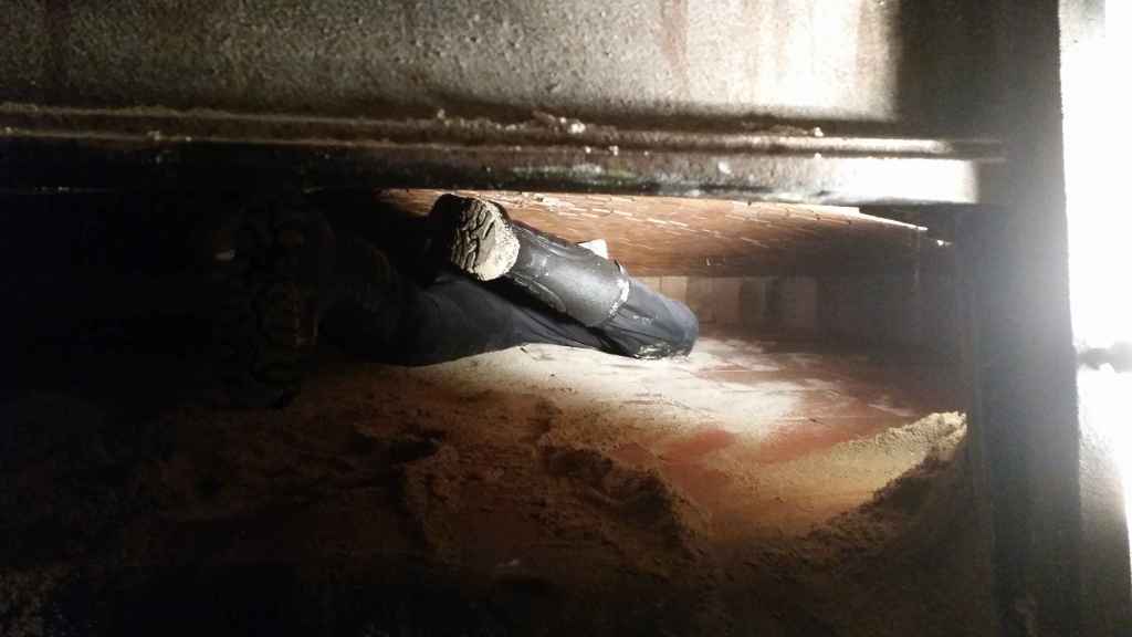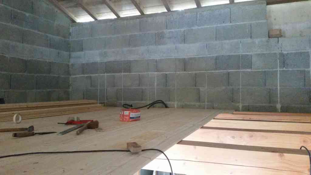 - Après séchage de cette chappe, nous réalisons le plancher bois de l’étage. Deux épaisseurs de plancher avec isolant entre.