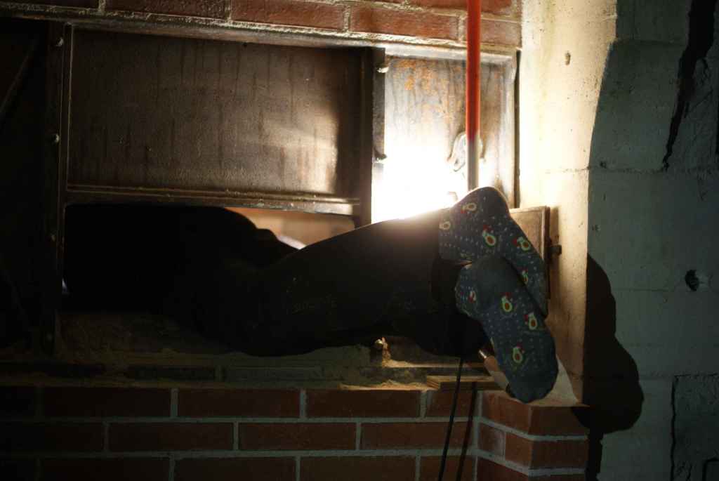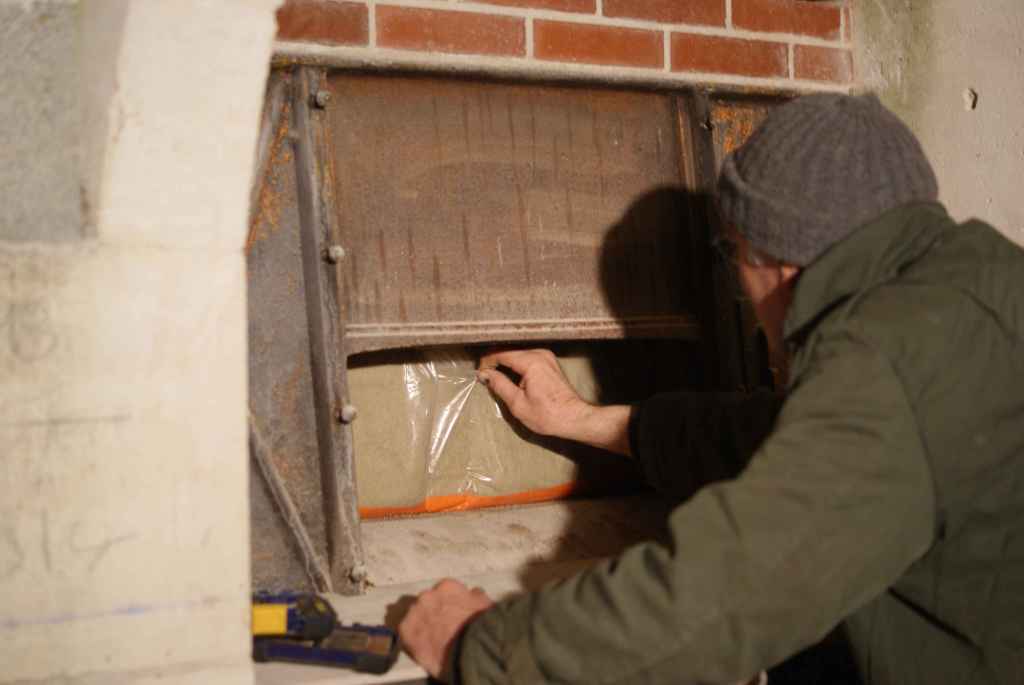 Afin de pouvoir visiter le conduit en cas de problème technique, et pour le ramoner, nous positionnons une trappe de visite. Nous l’avons créée avec une cornière métallique, pliée et soudée dans la forme nécessaire, puis nous avons coulé le couvercle en béton réfractaire. Ainsi le conduit est bien fermé mais le couvercle peut d’enlever au besoin.
