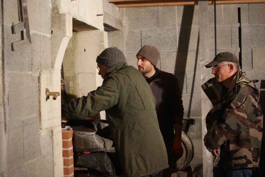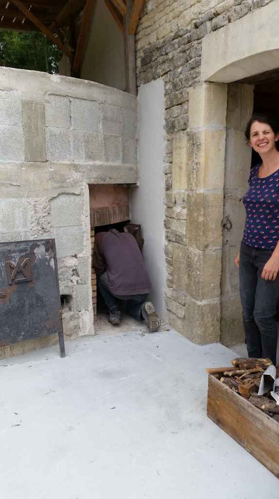 Ca y est, nous y sommes ! 5 août 2021, c’est l’heure de la première allumette pour mettre en route le four. Nous observons les premières fumées sortir de la cheminée. Il nous faut au moins une quinzaine de jours de petites chauffes quotidiennes pour monter en température l’ensemble des matériaux avec une dilatation douce et faire sortir l’humidité. On appelle cela le « dérhumage du four ».