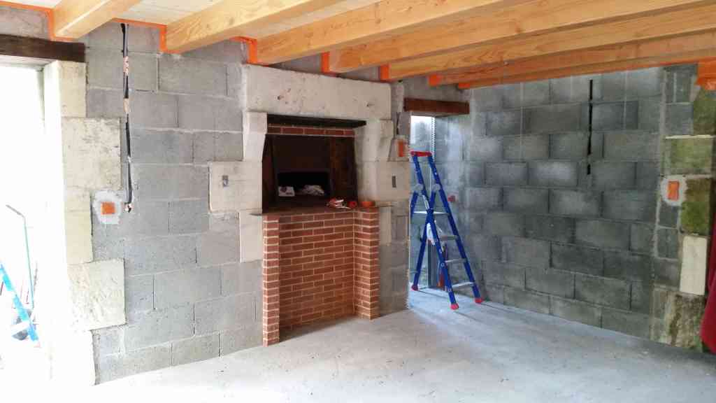 Sous cette façade, nous montons un mur de briques pour l’esthétique ainsi que pour s’isoler du foyer.