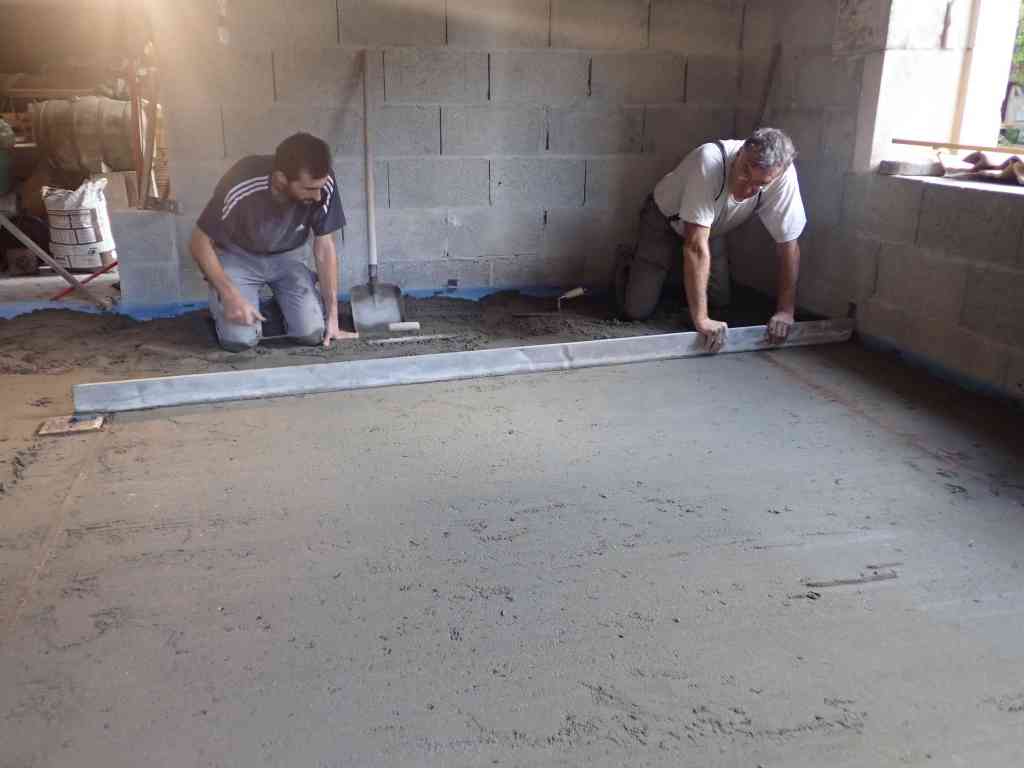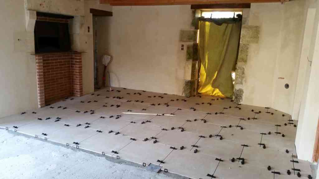 - Avant la pose du carrelage, nous réalisons une chappe de 6 cm. Elle recouvre l’isolant ainsi que les tuyaux du chauffage au sol.