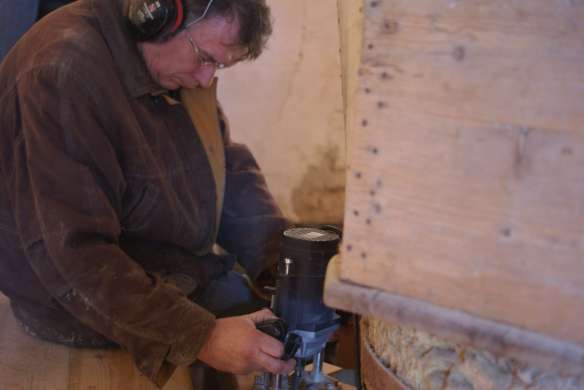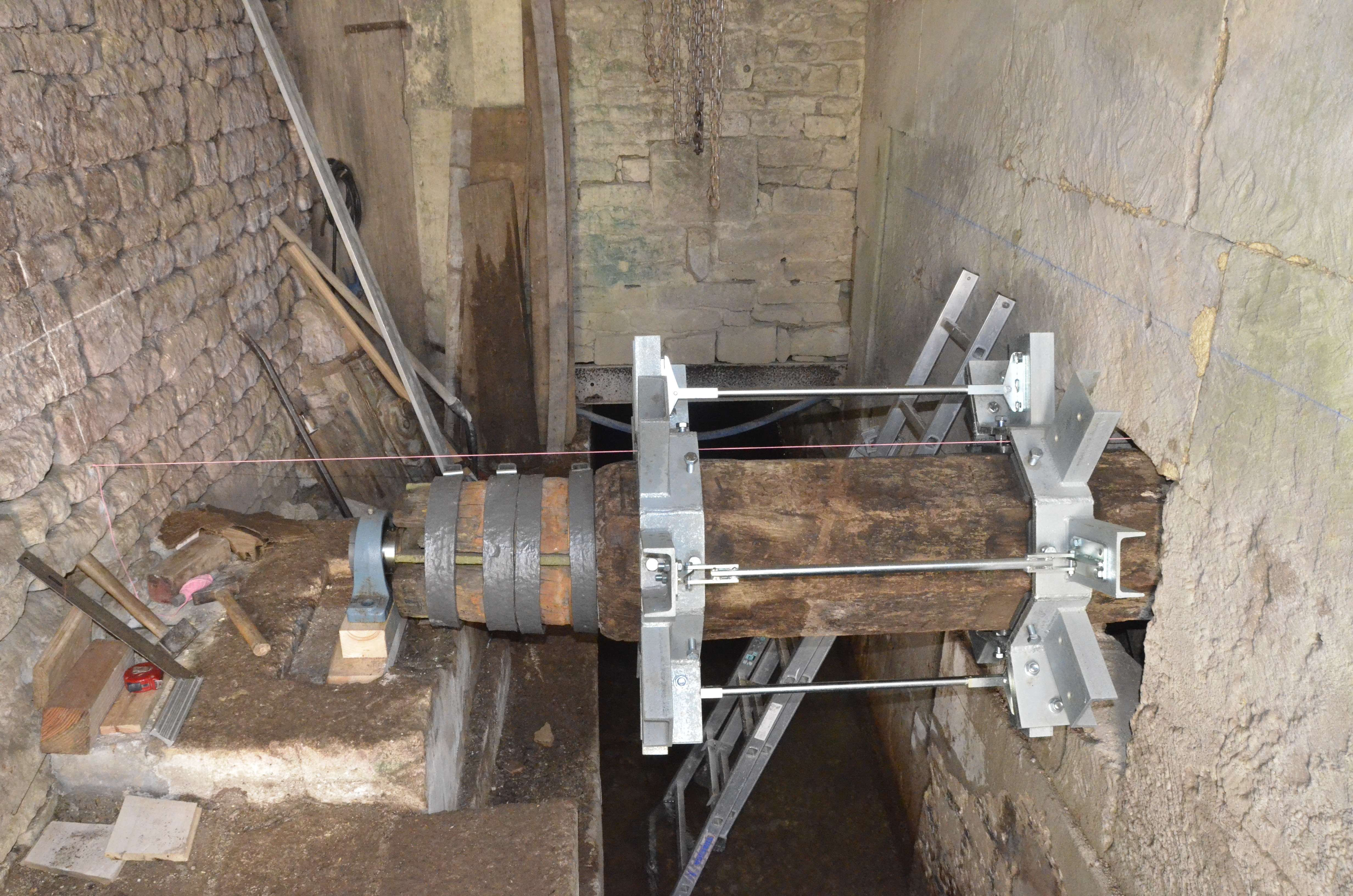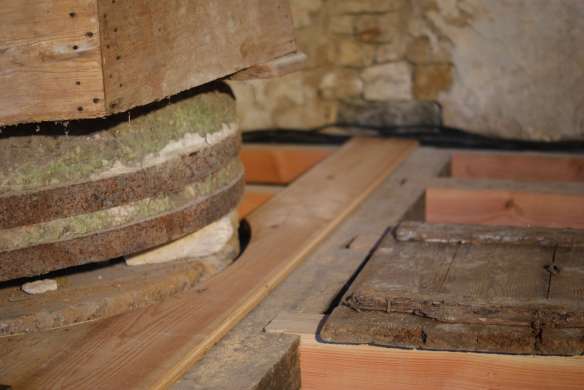 Désormais il nous faut restaurer les meules de pierre. Afin de sécuriser les travaux nous avons commencé par refaire le plancher de l’étage. En 2019, un atelier taillage de meules s’est fait sur place avec une professionnelle. Reste à revoir le système de transmission entre la roue et les meules.