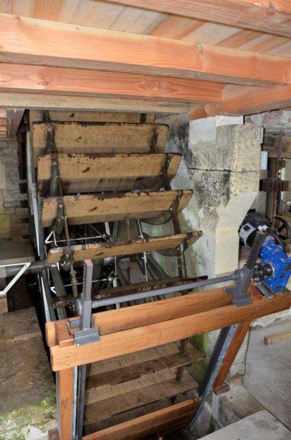 Ici, la roue à aubes, de type « Zuppinger », 4m de diamètre, 1,07 de large qui tourne à 6,4tr/mn sous une hauteur de chute de 0,90m est régulée par une vanne ouvrière semi-automatique.