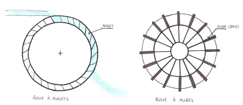 Il s’agit d’une roue verticale (axe horizontal), à aubes, de côté. Explications :