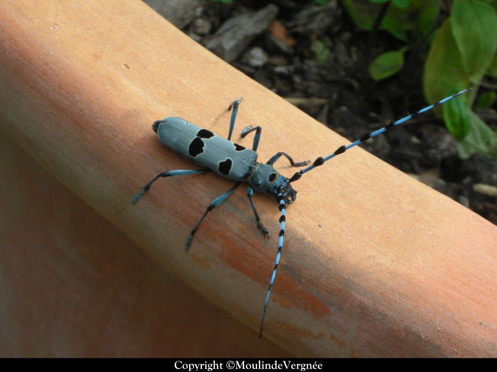 La Rosalie des Alpes est d’une couleur bleue cendrée assez inhabituelle et présente de très longues antennes.